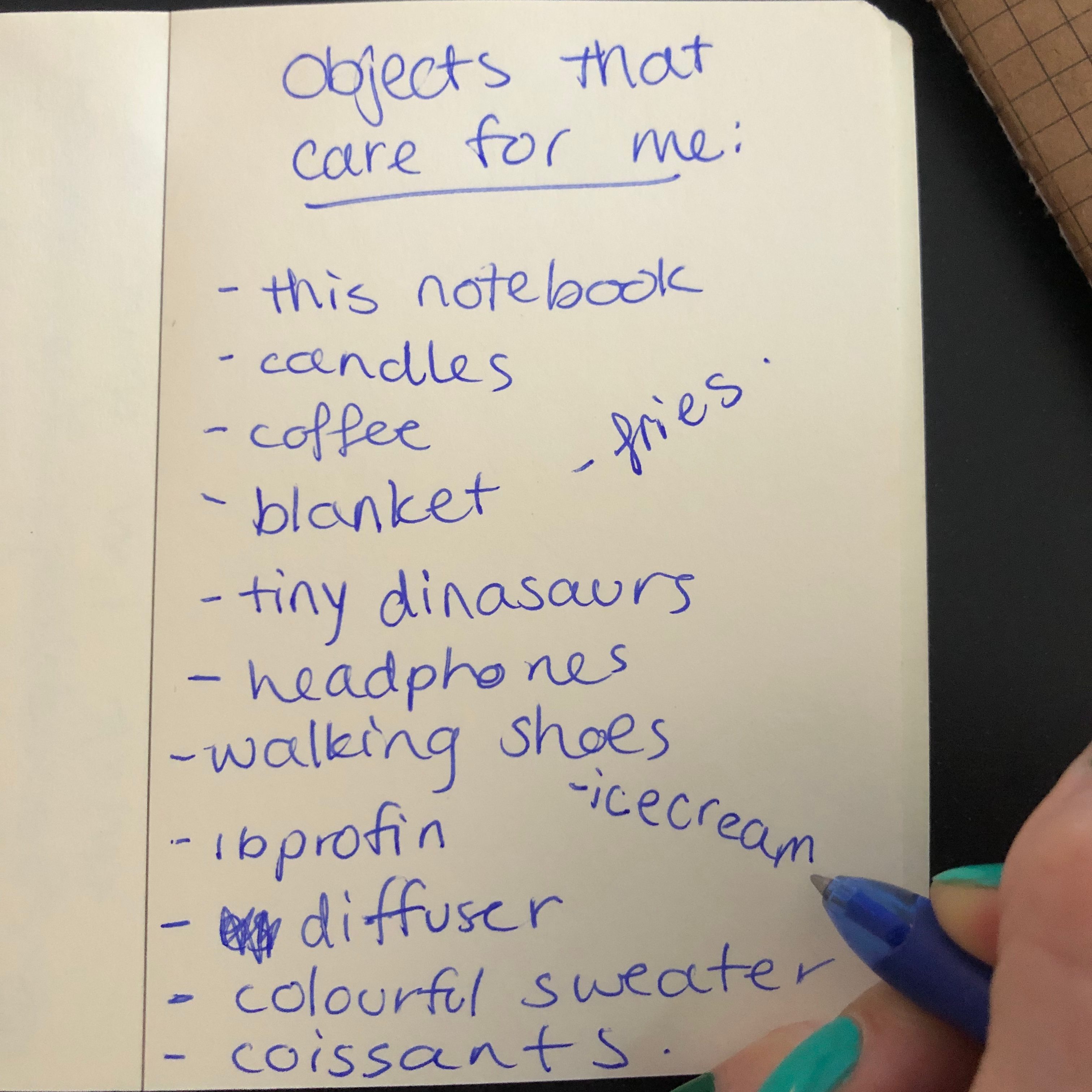 [3min] What cares for you? Write a list of objects that care for you. Try not to sensor yourself and just write whatever comes to mind. If you want: share one of the objects-of-care in your list in the chat.